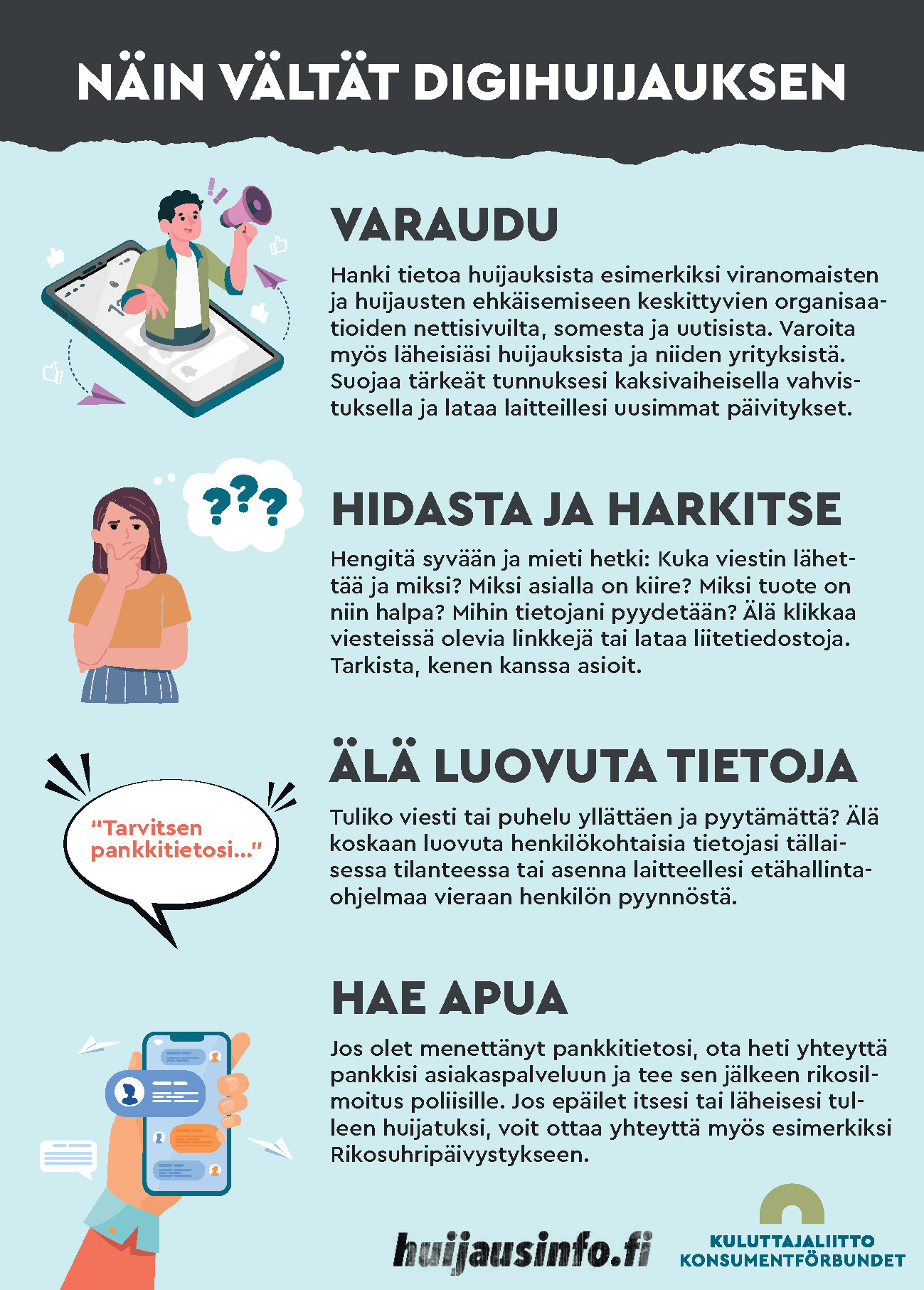 Näin vältät ja tunnistat digihuijauksen Infograafi Kyberuhkat, Varautuminen Nämä infokortit opettavat sinua tunnistamaan ja välttämään digihuijaukset arjessa. Oppaan on tuottanut Kuluttajaliitto. Löydät infokortit täältä